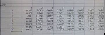Copy and paste one column in the spectrophotometer 96 well format at time into your group's spreadsheet.  After pasting column 1, 2 and 3 you will begin the next set of replicates (columns 4-6 then 7-9).