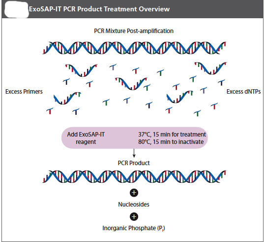 ExoSap-IT reagent treats PCR products ranging in size from less than 100bp to over 20kb with no sample loss. The clean-up reagent is proprietary, but it is based on Exonuclease I and Shrimp Alkaline Phosphatase. Recombinant (rSAP) is added directly to the PCR product to degrade primers and to dephosphorylate dNTPs that were not consumed in the reaction. Add EXSAP_IT reagent directly to the reaction products following PCR. Since ExoSAP-IT reagent is active in commonly used PCR buffers, no buffer exhange is required.