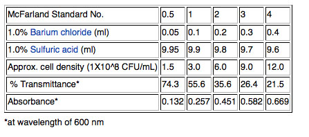 2) Although cell density can be measured more accurately using a spectrophotometer to measure optical density (OD) at 600nm, we will use a quicker method that will work well enough for our purposes. Pipet one ml of the broth culture into a sterile glass tube and adjust the concentration of the cells by matching by eye the "cloudiness" (turbidity) of the cells in the  glass tube to a standard provided by your instructor.  We will use a McFarland 0.5 standard; the 0.5 refers to the approximate concentration of organisms in solutions which is 1.5X108 cfu/mL for the 0.5 standard.  Other common standards are shown in the table below.