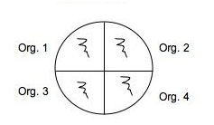 Fig: 6-1. Testing of multiple isolates in one plate can be accomplished by dividing a plate into 4 (OR MORE) sections.  Be sure the inoculum is placed in the center of each section and that you check the plate for growth regularly.