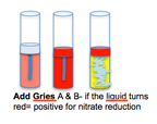 Add a few drops of Gries reagents (follow manufacturer's directions) to cultures of bacteria grown in MNM medium. If the liquid at the surface turns red (a darker red than the medium, if it is red), that is a positive test for nitrate reduction to nitrite. No color change is a negative reaction.