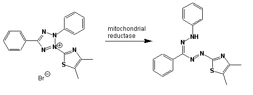 Scheme showing the reduction of MTT to formazan. Image created by Jenpen 21 September 2006