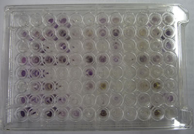 You will hear the spectrophotometer slit lamp passing over the plate to "read" it, meaning that it is measuring absorbance at the nm wavelength best for detecting purple colored pigments (590nm). The purple color formation is a function of the total redox reactions that occurred in the well as the microbes use each carbon source metabolicaly and change the colorless form of the dye, 5-cyano-2,3,-ditolyl tetrazolium chloride (CTC), to a purple- colored product.