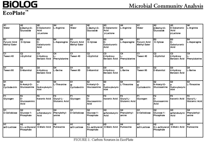 The BIOLOG-ECO™ 96 well plates we will use contain 3 replicates of 31 carbon sources and three water control wells. Most of these  substrates are commonly associated with plant root exudates and, thus, are likely to be available to your soil community. The method for community carbon source profiling that we are using is simple and rapid, but its interpretation must be carefully evaluated, recognizing that the methodology is imperfect.  The following studies discuss issues and limitations of CLPP (community level physiological profiles) analysis.