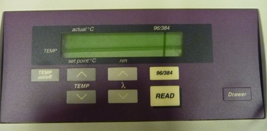 Turn on the Spectramax 340PC spectrophotometer using the switch located next to the plug in the back on the right hand side (as you face the spec).  The drawer will open. The drawer may, or may not, close on its own. If it doesn't, close it by pressing, once, the DRAWER button found on the Spectramax control panel (pictured in purple on the instrument photo below). It is important to keep the drawer closed as much as possible to prevent dust from entering the spectrophotometer.  The machine will automatically start a required calibration. Allow up to 10 minutes for the Spectamax340PC to warm up after the calibration and BEFORE you attempt to insert your plate.