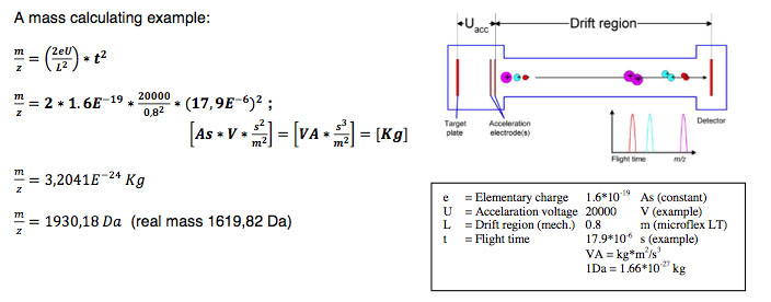Via the flight time between acceleration and hitting the detector the mass of an ion can be determined (TOF = Time of Flight technique). The complete process needs to take place under vacuum of better than 3*10-6 mbar. As better the vacuum as less collisions