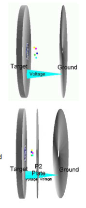 Next step was to use a delayed extraction to accelerate ions (pulsed ion extraction - PIE). Between target plate and ground plate a second potential plate (P2) is placed to modify the electrical field. The P2 plate has the same potential as the target plate. So no acceleration will happen after generating the ions. After a delay time, the P2 potential will be decreased and the acceleration starts. The fortune is that the effect of loosing resolving power because of different kinetic energy of equal ions will be reduced. A higher resolution for a small mass range can be observed.