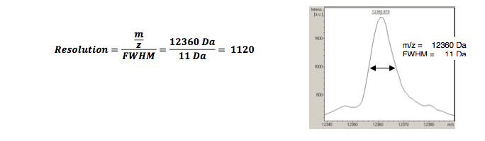The mass resolution for a single peak is calculated by dividing the peak mass by the Full Width at Half Maximum (FWHM). The resolution value can be checked in flexControl and flexAnalysis directly.
