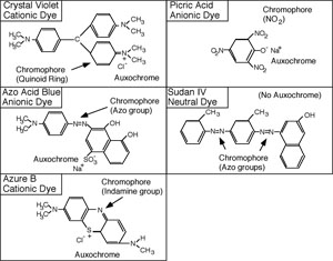 The synthetic dyes are classified as acid dyes, or basic dyes, depending on whether the molecule is a cation or an anion. The introduction of the terms acidic and basic was unfortunate because it would be more revealing to refer to them as cationic or anionic dyes.  A look at the structural formula reveals the nature of the dye.