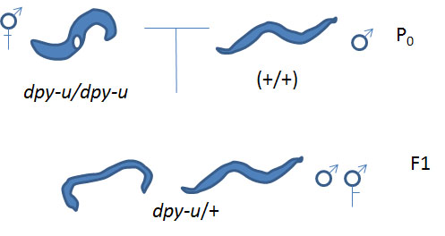 Cross #1: unknown Dpy hermaphodites (dpy-u/dpy-u) x N2 males (+/+) yields dpy-u/+ progeny