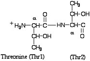 - Type restrict Thr741,Thr742 or simply restrict 741,742 into the Command Line Window--the restrict command eliminates from the screen everything except that designated in the expression following the word restrict. In the Command Line type save followed by a name for your file that ends with .pdb. This file will be saved to the RasMol folder. You can now see how it’s possible to create a new file of any portion of the entire molecule just by using the restrict command and saving the file. Now Close the 1JYVsubA.pdb file and Open the one you just saved. Change the display to Ball & Stick and the Colour to CPK and activate Labels under the Options menu. Try clicking on some of the atoms and see what happens in the Command Line Window--Identify the two α-carbons--the abbreviation used is CA. (The picture below should remind you what we mean by α-carbons.) See if you can find the peptide bond and the side chains or R groups of the two threonines. As I’m sure you have already observed there are no hydrogens in this molecular model.