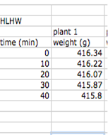 1) Create a summary table with each variable you would like to graph in its own column. In this case, we are looking at time vs. plant weight (g).