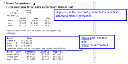 To test differences between pairs of means, back at the red arrow Select: Compare Means, then all-Tukey HSD. You will see the following print-out: