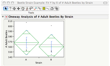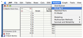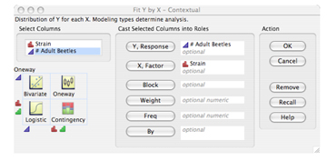 5) This opens a new window as below. First, highlight ‘# Adult Beetles’ in the ‘Select Columns’ box on the left. Next, click the ‘Y, Response’ button. The # of adult beetles is considered to be the response (or dependent) variable since the number of adult beetles in a population depends on whether they are from Strain A or Strain B. Then, highlight ‘Strain’ and click on the ‘X, Factor’ button since strain is the fixed (or independent) variable, indicating it is the predetermined variable in our experimental design.