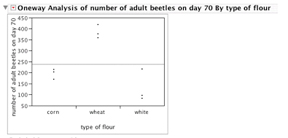 Once your data are entered: • Under the Analyze menu, select Fit Y by X • The value that you “set” is the independent variable. This variable belongs on the X axis. In this case the categorical (or nominal) variable is the selected flour types. Set this as your X value. • The dependent (numerical) variable is what you measure, and in this example would be the number of adults. Set this continuous variable as your Y value. • Click on OK and you will see a graph something like this: