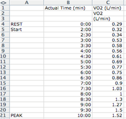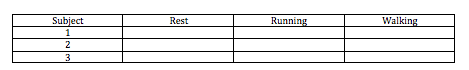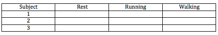 1) Download either a pre-formatted class spreadsheet or create your own table in Excel to organize your experimental data. You will want to include columns for each experimental condition and numbered rows corresponding to each subject. For example, if you are collecting heart rate data under 3 conditions (rest, running, and walking) your table might look like this: