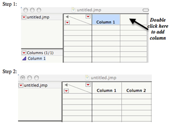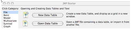 1) When you first open the JMP program, a ‘JMP Starter’ window will appear as below. Select ‘New Data Table’ and a new table called ‘untitled.jmp’ will open. Go to ‘File’ and select ‘Save As’ to save your file.