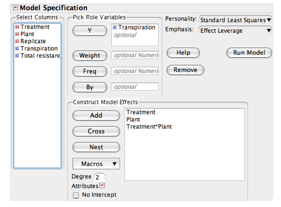 To construct the test 1. highlight Treatment in the Select Columns field and then click Add in the Construct Model Effects field 2. highlight Plant in the Select Columns field and then click Add in the Construct Model Effects field 3. highlight both Treatment and Plant by clicking on Treatment and then holding down the shift key as you click on Plant. Click on Cross to add the interaction between Treatment and Plant