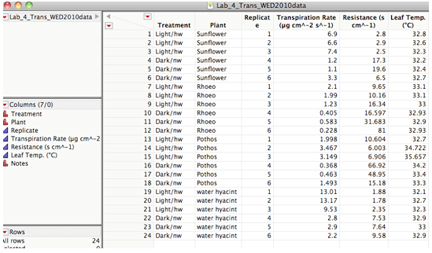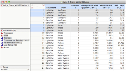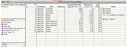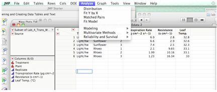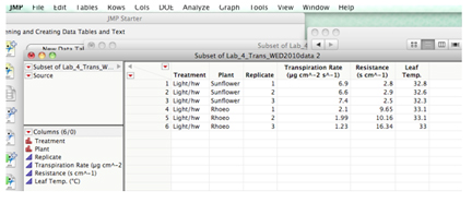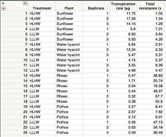 Input the data as illustrated below. Treatment, Plant and Replicate columns have the data type 'character' 'nominal' and Transpiration rate and Total Resistance are 'numeric' 'continuous'