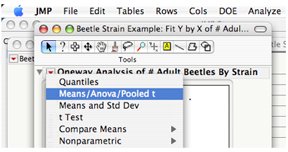 7) Click on the red triangle, and select ‘Means/ANOVA/pooled t’ from the menu to run the t-test. Please note that the ‘Means/Anova/Pooled t’ option will only appear if only two variables are being compared (e.g., strains A and B). If you have all four variables in one JMP spreadsheet (A, B, C, and D), that option is not available. You must either create a subset table with only the two groups you wish to compare (by highlighting the two sets of data you wish to compare, then go under ‘Table: subset’) or reorganize your data with only two groups per JMP spreadsheet as directed above.