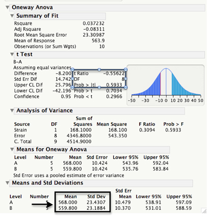 Under the ‘t Test’ heading (assuming equal variance), we are interested in the ‘t Ratio’ (which is the tstat or your hand calculated tcalc), ‘DF’ or degrees of freedom, and ‘Prob> |t|’ which is the P-value. For graphing, we are also interested in the means +/-SD (or SE) reported in the bottom table. (See the Graphing Means in this file for details on graphing and how to incorporate figures into a scientific paper.)