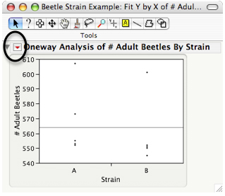 6) Click ‘OK’, and a new output window will open with a scatterplot of both Strain A and Strain B. You will see a small red triangle above the plot, which is the dropdown menu for many analysis options.
