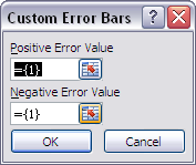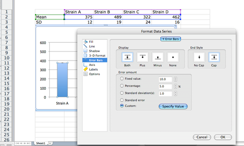 b. Click on the ‘Specify Amount’ button, and a window pops up with an entry for both positive and negative error values (see below). In each entry window, go and highlight the row of SD values, and click ‘OK’. Your SD values should now correspond with their respective means as error bars.