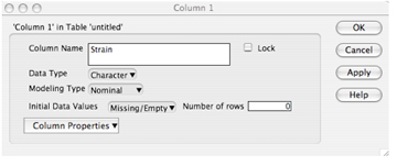 c. Label the first column heading ‘Strain’ to represent the type of beetle strain (A, B, C, or D). Under ‘Data Type’, you must specify whether the data in this column is numerical or character (letters). Since you are representing ‘Strain’ by a letter designation, select ‘Character’ as data type. Then click ‘OK’.
