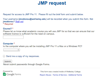 You will need to fill our a request for JMP. Identify yourself as a taking a Biology course.