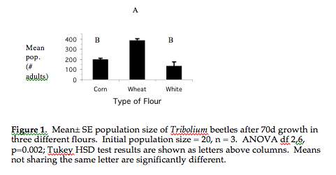 Example of statistical test reporting: “All three grains supported beetle population growth but the greatest increase in population size was seen in wheat flour. After 70 d, the mean number of adult beetles in the starting population (20) had increased by a factor of 20 in wheat flour but only by about 10-fold in corn and 7-fold in white flour (Fig. 1). Mean population sizes in corn or white flour were not significantly different from each other but were significantly different from the mean population size in wheat flour (ANOVA, F = 22.7, df = 2,6, P = 0.002; Tukey HSD test, P < 0.05 (Table 1 OR Fig1).”