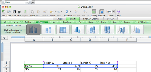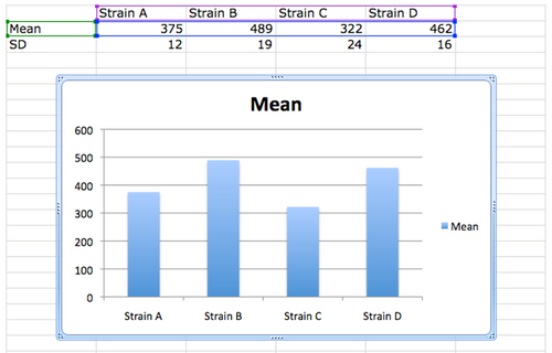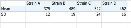 3) To begin graphing, first highlight only the first 2 rows of your summary table including column titles (Strain A, Strain B, Strain C, and Strain D) and the row with means. (Do not highlight the SD row, as we will add the SD as error bars later.)