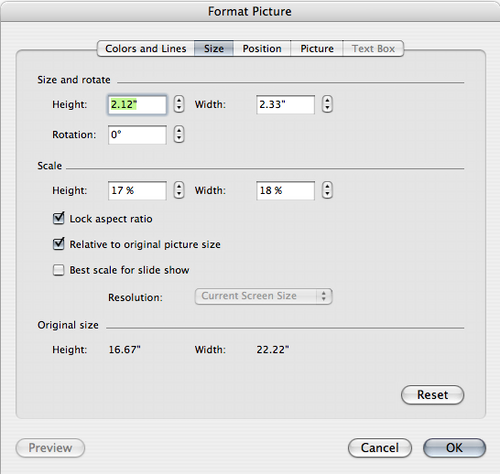 4. Resize. You can specify image size in all versions of PowerPoint. In Microsoft PowerPoint 2004 for Mac, double click on the picture. A window opens entitled “Format Picture”. You need to click on the arrows on the right of "Height" or "Width" (see below) to adjust the size. Make sure that “Lock aspect ratio” is selected. A resized, smaller picture might disappear from view but will be found on the screen in the upper left corner. Drag it back on the slide. In PowerPoint 2008 for Mac, double click on the picture to display a window entitled "Format Picture" with "Size" in the left column menu. In PowerPoint 2010 for Windows7 Enterprise, right click to open window showing "Size and Position".