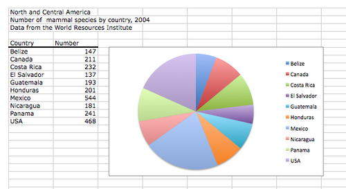 - Highlight both category and number data, but not the column labels. To generate a graph, chose "Charts" and then "Pie" from the Menu bar directly above the workbook. Then select the pie chart format you prefer. The farthest left option is both simple and clear, and generates both the chart and its legend, as in the image below.