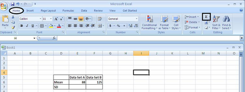2) Calculate the mean of each group (Data Set A and B) using the AutoSum function located under the “Home” tab on the right-hand side.