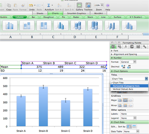a. Add error bars representing SD (Standard Deviation) b. Label both axes (include proper units) c. Remove the title from the top d. Remove the grayscale background e. If needed, choose patterns for each column so it is easy to read the legend (i.e., different colors all look grey on a printout)