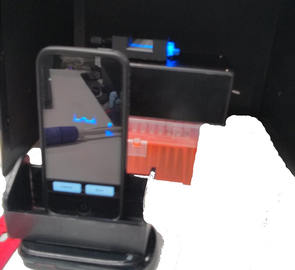 Single-Drop Fluorimeters are used to measure fluorescence by analyzing the type and the amount of fluorescent molecules in a substance. For example, if SYBR is mixed with DNA, the DNA will enable the SYBR to fluoresce and consequently the device will be able to detect the amount of DNA retrieved from PCR. Below is an image of the fluorimeter device.