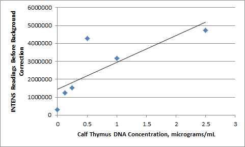This image shows that the intensity of the SYBR dye increases as the concentration of DNA increases. The only concentration that was unusual in the experiment was the 0.50 concentration of DNA. The rest of the values on the graph increased accordingly.
