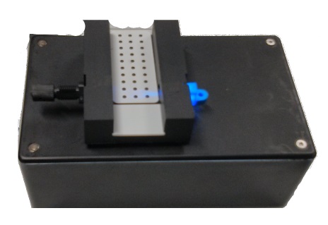 The fluorimeter was tuned on and the slide was adjusted so the blue light fell between the two rows of dots