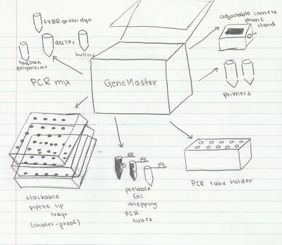 Primers start by recognizing the "target sequence", which is the cancer oriented SNP known as rs17879961. This specific cancer reverse primer will locate the complementary target sequence in the cancer SNP template to bind together. The primer needs to find a matching target sequence to properly bind together. The non-cancer allele includes the sequence ATT, but the cancer allele includes the sequence ACT. The forward primer like reverse primer must find a complementary sequences to be able to bind together. However, the primer will not bind to the patient's sample unless it can bind to every single part of the template strand. Therefore, even if it is off a little bit the PCR reaction will not happen and the strand will not amplify. The result for cancer will be negative. If the template strand is cancer positive, however, then then they will match and the strand will amplify. The result for cancer will be positive in this case. Feature 2: Consumables Kit The GeneMaster PCR kit contains a collection of materials and consumables necessary to conduct PCR. Our kit contains PCR mix, which includes tubes of Taq DNA polymerase, dNTPs, SYBR green dye, and polymerase buffers. It also contains primers and pipettors. Additionally, the kit contains an adjustable camera phone stand which will be used for the fluorimeter. One problem encountered with the current camera phone stand was that it was very unstable and difficult to position. In fact, some student groups had to find extra materials to place under the stand to ensure that the phone was at an adequate height for picture-taking. In order to solve this problem, the GeneMaster PCR kit contains an adjustable camera phone stand, which is more sturdy due to a wider rectangular base, and easier to customize with a handle which elevates or depresses the platform. The camera phone stand also has a component that allows it to be attached to the base of the fluorimeter. This allows the camera phone stand to be used with phones of a variety of shapes and sizes without shaking or movement of the camera phone stand. Therefore, the process of picture-taking will be far more efficient and convenient and the device is able to be used by a variety of students and researchers. The kit will also contain plastics which are used to store consumables. There will be a collection of PCR tubes, a PCR tube holder which can be used to organize tubes during a reaction, and stackable pipette tip trays. The PCR tubes will be arranged in strings of plastic connected to one another. Packaging of the PCR tubes can be carried out in a way that effectively prevents a major problem encountered throughout the process: bleaching of the SYBR green dye. The PCR tubes as well as tubes used to contain this dye should be covered with a light-blocking foil that can be removed manually when necessary. This will minimize contact between the dye and light, ensuring that the SYBR green dye remains potent. However, if the SYBR dye has to be observed for whatever reason or if the content of the tube has to be viewed, the foil can be peeled off. Additionally, packaging can be made more compact by stacking pipette tip trays atop one another, rather than having a collection of many trays that take up unnecessary space. These pipette tip trays should be placed in a shatter-resistant, cohesive container that will keep the trays intact even when dropped.