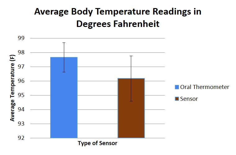 The graph demonstrates that there is a clear difference between the average temperature readings of the oral thermometer and the sensor.Furthermore, the error bars are larger and more significant with the sensor, implying that the sensor is less accurate than the oral thermometer.