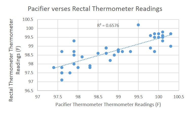 After running a t-test on the data, a p-value of 3.30237E-22. Because the p-value was below .05, this means that there is an extremely low chance that the results are the same. After running a Pearson's coefficient test, it was found that the r-value was 0.050573103, meaning that the results between the oral thermometer and the sensor were not correlated.