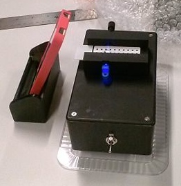 Put a glass slide into the fluorimeter, making sure that the light is in-between two rows.