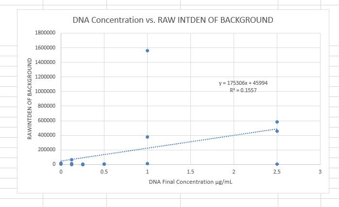 The surface of the slide is covered with extremely water-resistant Teflon-- however, the slide also has separate sections which are simply glass. This allows for the blue LED light pay special focus to the droplet, which should increase the intensity and the degree to which fluorescence can be detected. The difference in the surface of the slide allows for the SYBR green dye to bind with DNA and form a substance that ends up going closer to the surface. The use of the lightbox makes sure that it is easier to detect fluorescence within the drop. This is repeated for each calibration solution, which ranges in the concentration of DNA from 0 mg/mL to 2mg/mL. The images from each of these solutions is analyzed by ImageJ, to find the RAW INTDEN of both the droplet and the background.