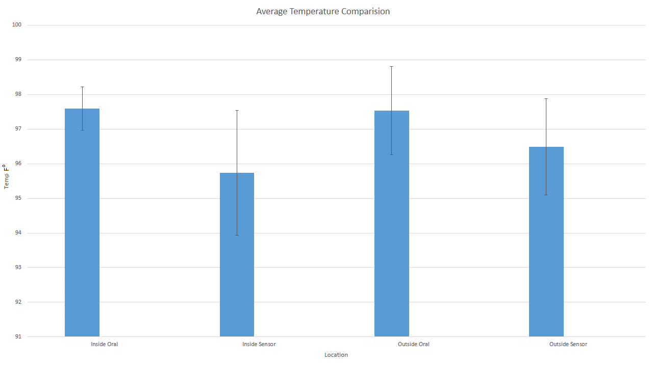 It can be observed from the data that there is a major difference from the different readings. The oral readings were always a lot higher and much more accurate than the sensor readings. The oral readings actually gave a temperature reading that is normal for a healthy human body. Such conclusions could result from flaws in the sensor design( sensor location, sensor insulation). Also the readings of the oral thermometer had a lower within group variation too.