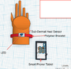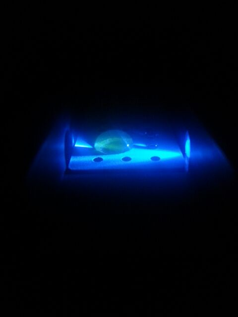 A glass plate is held down by the Fluorimeter with a blue light shining across the glass plate. On the glass plate will be your mixture which would include the DNA mixed with the SYBR green dye.