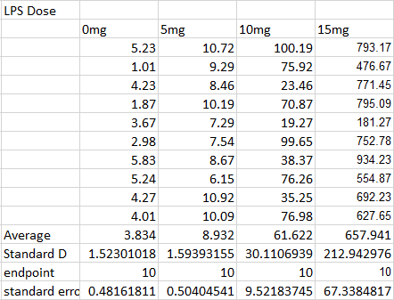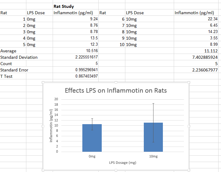 Summary/DiscussionHuman experiment- Because our Bonferroni Corrections and p-values were all lower than 5%, we can conclude that the drug LPS is affective in humans. The imflammotin levels increase in the blood as the mg increased. Rat Experiment- The drug LPS proved not effective in rats; the p-values was 0.86, which means that there was an 86% chance that the drug won't work on rats.