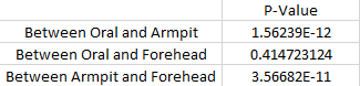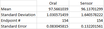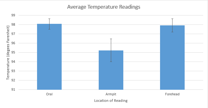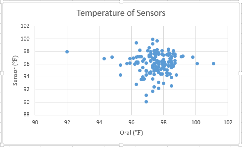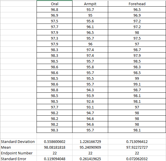 Summary/DiscussionThe T-Test showed a value of 8.048^-18. This p-value is way less than the 0.05 that is required, meaning that there is a very significant difference between the temperatures recorded from the oral and armpit thermometer. This means that the armpit thermometer is not very accurate, and would not be a desired product. Pearson' R value came out with a value of 0.0217. This shows that there is very little correlation between the oral thermometer and the armpit one. A design flaw that we saw is that the armpit temperature was very uncomfortable, very easily gave changing values (i.e. swinging of the arm drastically changed the reading), and it varied by where exactly the sensor was placed (i.e. higher or lower on the arm). Our group has decided that this sensor is not good and would like to propose a better one. The head seems to be where a accurate reading of body temperature can be read. Instead of going around with a thermometer in your mouth all the time, the forehead could give us an accurate reading as well. A sensor could be placed in the brim of a hat, visor, or headband, or sweatband. This would feel more natural, be less uncomfortable, and give a more accurate reading.