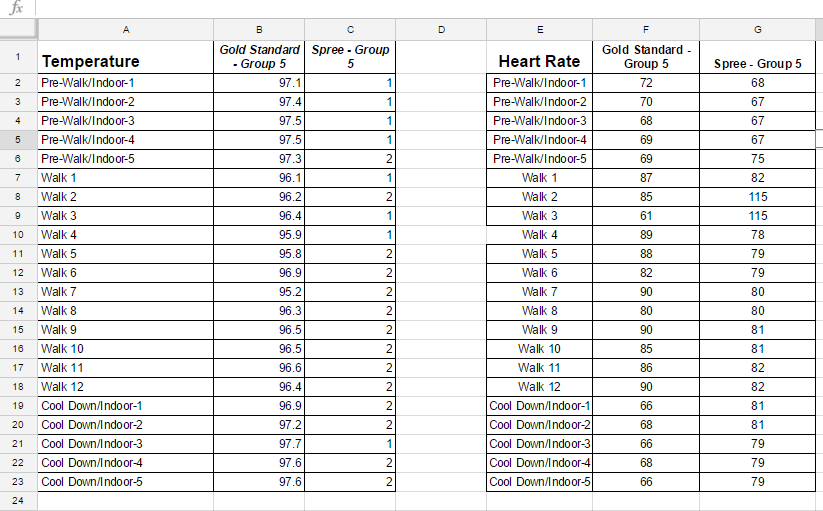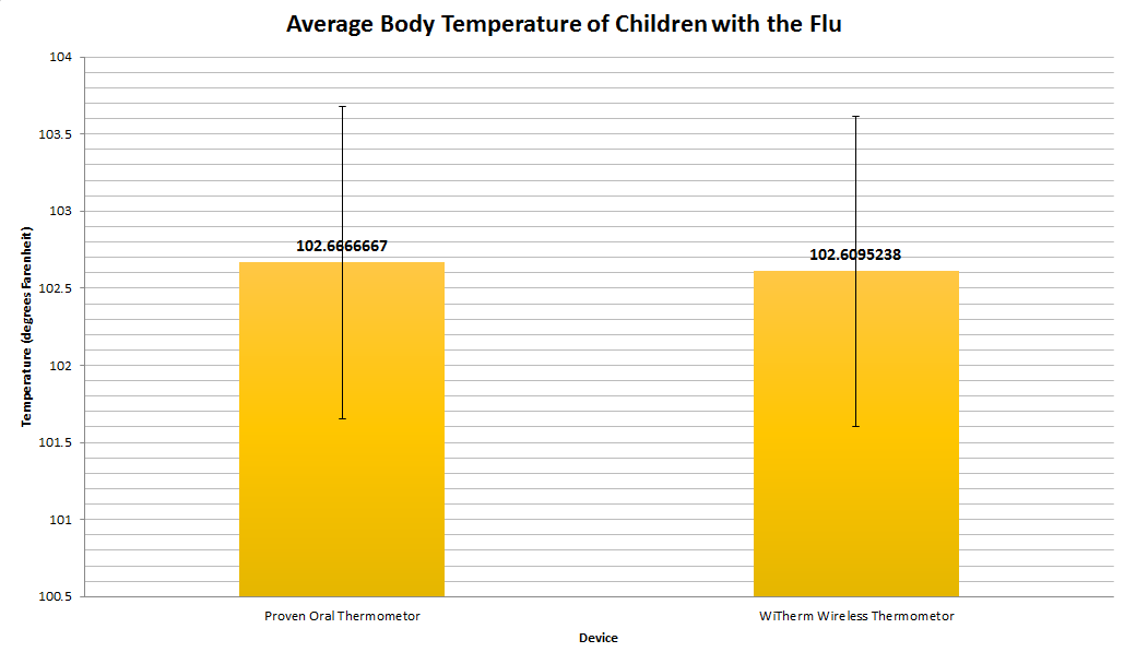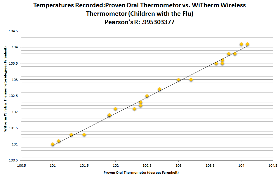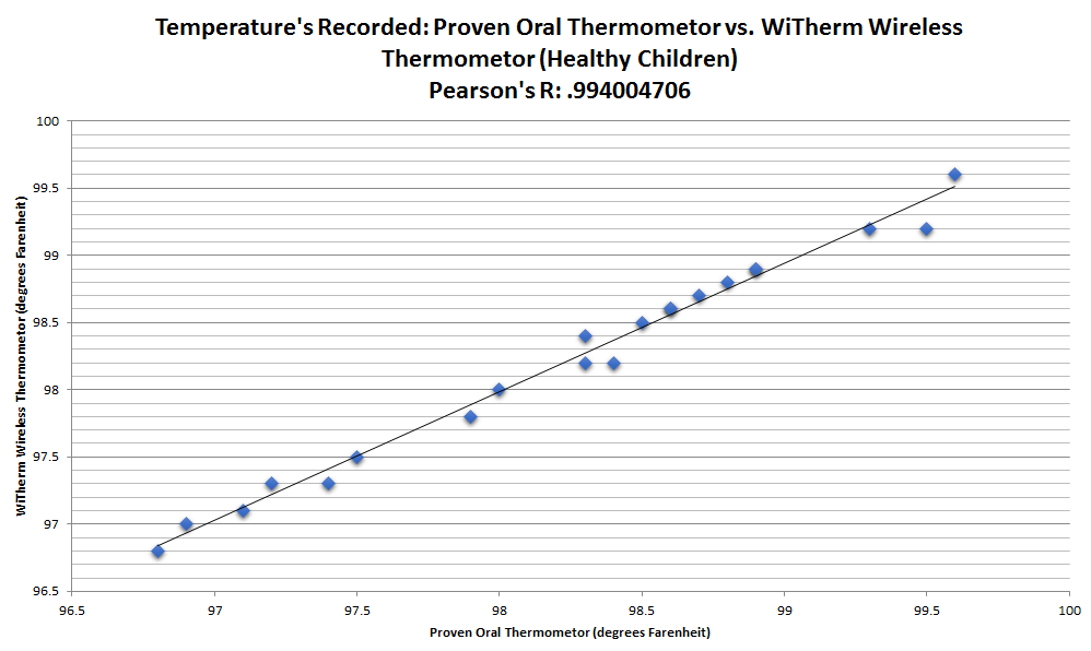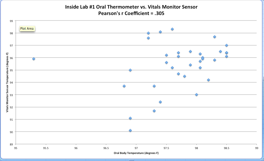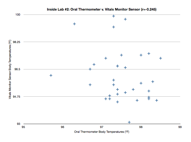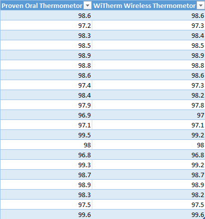 Summary/DiscussionA thermometer manufactured by Raiing claims to have the ability to measure temperature then wirelessly communicate the results to a smart phone with pristine accuracy(.1-2 degrees within the actual temperature). In order to test whether or not it's worth the eighty dollars to purchase and receive a correct reading, our group will test the measure of the sensor thermometer against the measure of an oral thermometer over a period of time. Testing the two simultaneously should reveal whether or not having a device like the wireless thermometer is even beneficial. If the two aren't showing the same relative reading, then it can be concluded that the sensor is not as accurate as Raiing claims it to be.  According to results in the actual final measures, the sensor was not as effective as Raiin had claimed. The sensor was consistent, but was consistently several degrees off from the oral thermometer. As said before, had the sensor been within a tenth of a degree or so, spending the money on the device would be worth the price. When T-Tests were run to obtain P-Values for each difference in the average temperature, the values calculated were supportive of the faults in the sensor. Every P-Value calculated (Inside #1, Outside, and Inside #2) was significantly under 0.05 demonstrating a significant difference in the two devices. Additionally, the Pearson's r correlations for the inside trial #1, outside trial and inside trial #2 were respectively 0.305, 0.03301 and .245. For this experiment, the ideal Pearson's r is 1. Because the collected values deviated significantly from 1, it can be concluded that the correlation between the proven oral thermometer and the sensor is not nearly enough to trust the tested sensor device in place of the proven device. The sensor is not worth the money Raiing is asking nor is it effective. An observation frequent in this experiment was that the sensor actually stopped working and stopped communicating body temperature to the device receiving the sensor's readings. The fact that the device even failed reinforces our conclusion that it really isn't a valuable purchase. The first change we would make to the sensor would be its bulkiness. Having a smaller transmitter and a smaller thermometer would be easier to but in a spot in which a better reading is more possible. If that were the case, it could actually be placed in the armpit or behind the ear. Having a more sensitive sensor would also improve the reading that consumer would receive on their device; which is what the sensor is supposed to and should be doing in the first place. The final most important piece of the design that could be changed to increase the efficiency, is the strength of the transmitter to the receiving device. Better communication can really do no wrong.