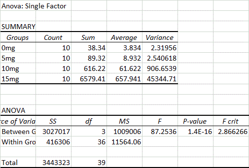 AnalysisExperiment 1: Human Study In order to evaluate the human study, an ANOVA test must be used because there are more than two groups of data. Because the ANOVA test resulted in a p-value of 1.4*10^-16, which is less than 0.05, it is considered statistically important. However, a post-hoc test using the Bonferroni Correction must be used to account for any errors that may have occurred while comparing the multiple groups of data. Six calculations of comparison must be done in order to compare each of the four groups of dosage to each other. Because there are six comparisons, the alpha number of comparison, which is usually 0.05, is adjusted to 0.0083333. A t-test for each of the six comparisons was calculated. Each test resulted in a value that is less than the corrected p-value, which means that it is indeed significant.