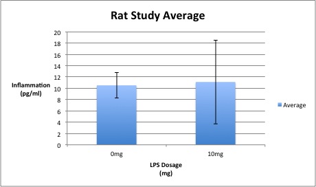 Summary/DiscussionTwo experiments were completed - the first one on humans and the second one on rats. These two experiments were designed to test whether or not the amount of LPS increases the amount of Inflammotin protein (as anticipated). The first experiment was done on four groups of ten people. The dosage of LPS was increased by increments of 5mg per group starting with 0mg. Test subjects varied in age, ranging from 60-82 years old. The second experiment, which was tested on rats, used two sample groups of five rats each. The amount of LPS was increased by increments of 10mg per group. By observing the Inflammotin protein level in all four groups and evaluating the P-value number, the data showed that an increase in LPS dosage resulted in an increased level of Inflammotin protein in humans. However, the study on rats shows that this relation does not correlate since the P-value is greater than 0.05.